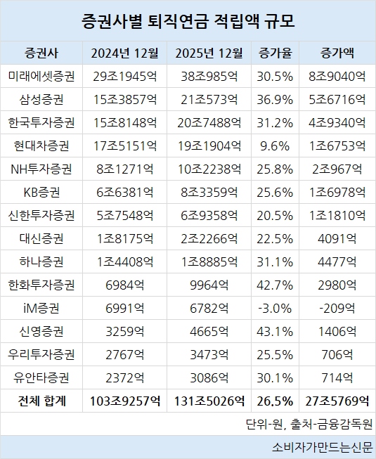 19일 금융감독원 통합연금포털에 따르면 지난해 12월 말 퇴직연금 사업자인 14개 증권사의 퇴직연금 적립액은 총 131조5026억 원으로 전년 말보다 27조5769억 원(26.5%) 증가했다.