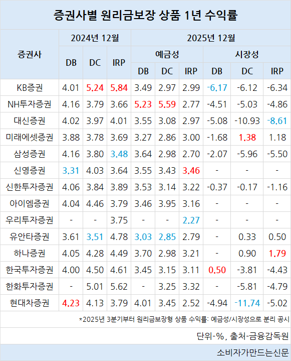 시장성 원리금보장 상품에서는 대부분의 증권사가 1년 수익률이 마이너스 수익률에 그친 가운데 DB에서는 KB증권(-6.17%)이, DC에서는 현대차증권(-11.74%), IRP에서는 대신증권(-8.61%)이 가장 낮은 수익률을 기록했다.