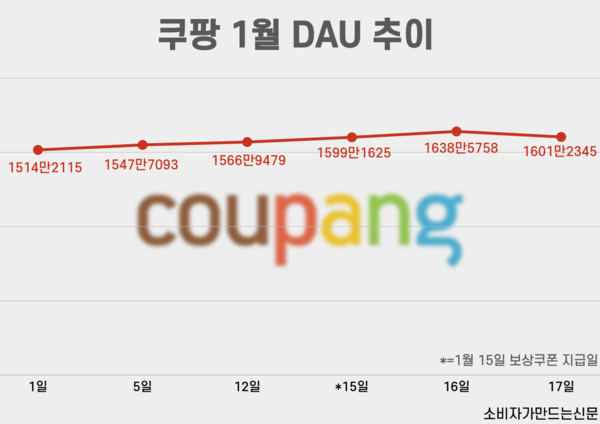 쿠폰 지급 당일인 15일 DAU는 1599만 명으로 전날 대비 약 38만 명 증가했고 이튿날인 16일에는 1638만 명까지 치솟으며 1월 들어 최고치를 기록했다.