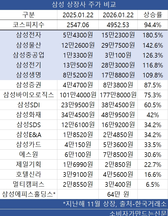 삼성그룹 상장사 주가 희비…삼성전자·삼성물산·삼성전기·중공업 두배 이상↑, 호텔신라 '부진'