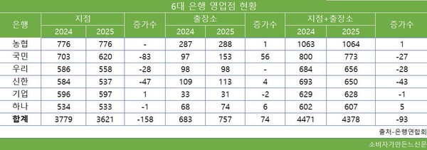 하나은행은 지점 수가 1곳 줄어든 대신 출장소가 6곳 늘었다. 기업은행은 6대 은행 중 유일하게 지점 수가 596곳에서 597곳으로 1곳 늘었다. 반면 출장소는 33곳에서 31곳으로 2곳 감소했다. 농협은행은 지점 수는 그대로인데 출장소만 1곳 늘었다.