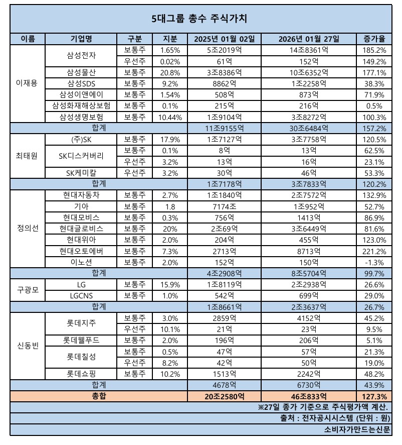28일 소비자가 만드는 신문이 5대 그룹 총수의 주식가치를 집계한 결과 46조833억 원(27일 종가 기준)으로 지난해 1월 2일 20조2580억 원 대비 127.3% 증가했다.