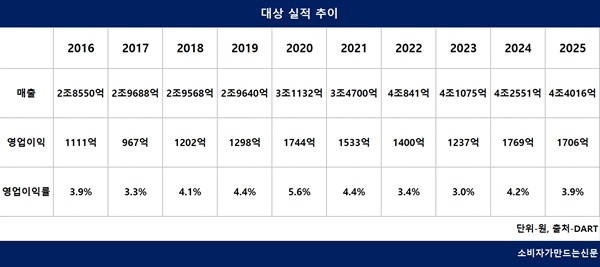 지난해 매출은 4조4016억 원으로 전년 대비 3.4% 늘었다. 미국 상호관세, 원재료 가격 상승 등 외부 요인에도 불구하고 영업이익률은 3~5%의 안정적인 수준을 유지했다.