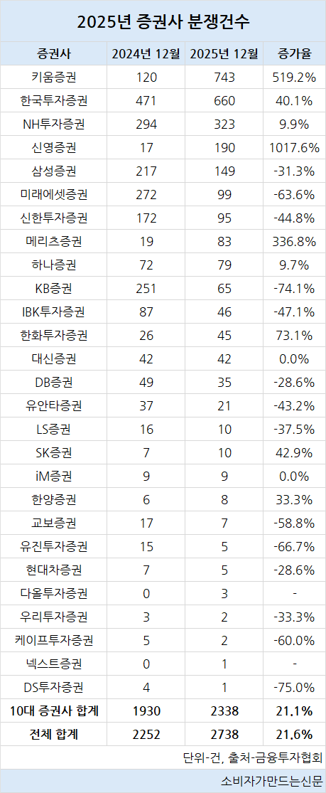 지난해 국내 증권사 중 분쟁건수가 가장 많은 증권사는 키움증권으로 전년보다 519.2% 증가한 743건이었다.