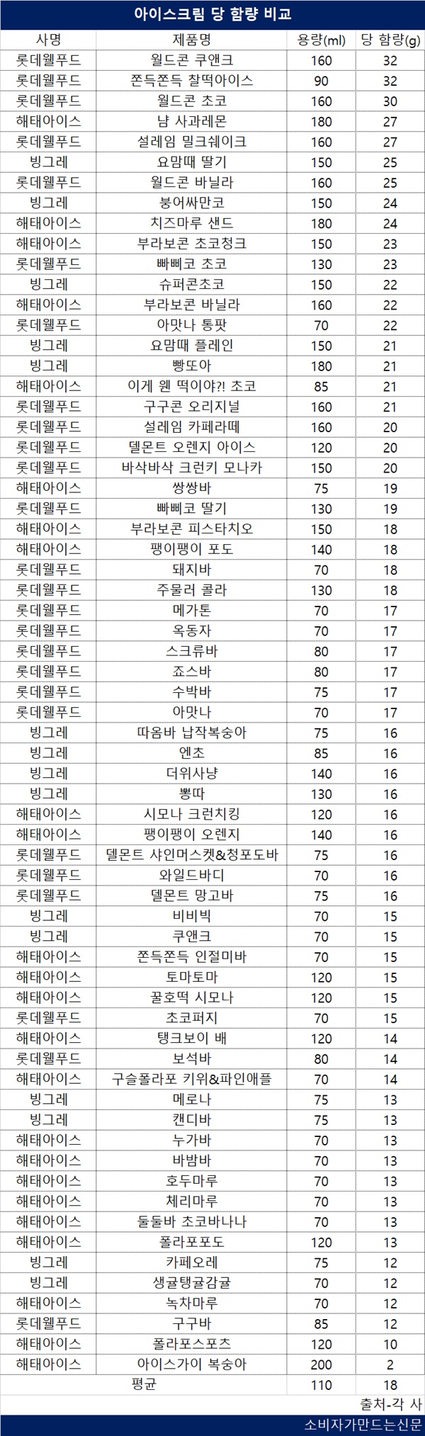 2일 소비자가만드는신문이 빙그레, 롯데웰푸드, 해태아이스 등 3개 사에서 판매하는 아이스크림 65개 제품의 당 함량을 조사한 결과 평균 18g으로 집계됐다. 아이스크림 한 개를 먹으면 3g짜리 각설탕 6개를 먹는 것과 마찬가지인 셈이다.