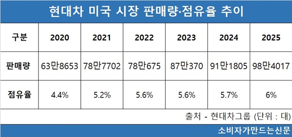 현대차는 기술 보완과 보증 확대를 통해 신뢰를 회복하며 지난해 미국 판매량 98만4017대를 기록했고 연간 100만대 고지를 눈앞에 두고 있다.