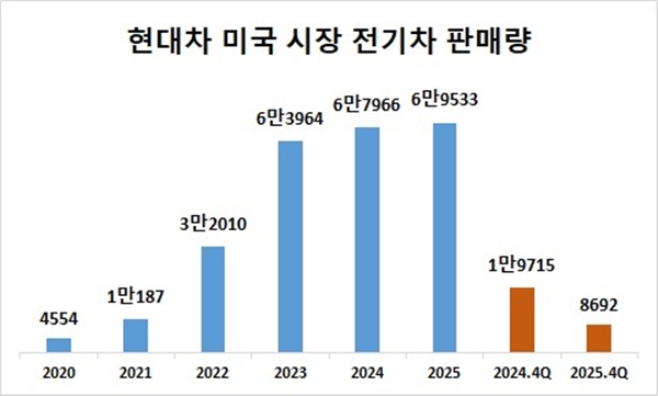 전기차 세액공제 종료 영향에 따른 미국 시장 전기차 판매 부진은 과제다. 현대차의 지난해 4분기 미국 시장 전기차 판매량은 8692대로 전년 동기 대비 55.9% 감소했다. 업계에서는 전기차 판매 부진이 올해도 이어질 것으로 전망하고 있다. 전기차는 수익성이 높은 차종으로 평가받는 만큼 수익성에 악영향을 미칠 것으로 예상된다.