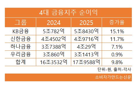 지난해 4대 금융지주의 당기순이익 합계는 17조9588억 원으로 전년 같은 기간 16조3532억 원 대비 9.8% 증가했다. 4대 금융지주 순이익이 연간 17조 원을 돌파한 것은 사상 처음이다.