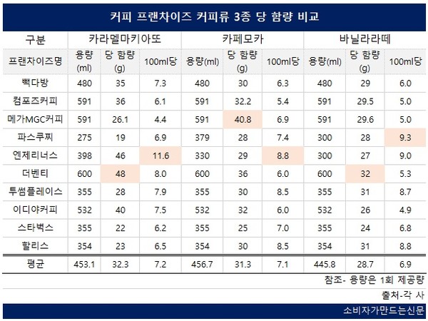 10일 소비자가만드는신문이 △스타벅스 △투썸플레이스 △이디야커피 △빽다방 △메가MGC커피 △컴포즈커피 △파스쿠찌 △엔제리너스 △더벤티 △할리스 등 국내 커피 프랜차이즈 10곳의 커피 6종류와 음료 당 함량을 조사한 결과 평균 37g으로 조사됐다.