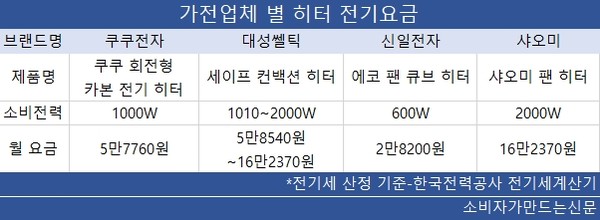 이어 "전기세를 줄이기 위해서는 단열 보완 및 부분 난방 제품과 병행 사용하고 히터는 필요한 시간대에만 가동하는 것을 추천한다"고 덧붙였다.