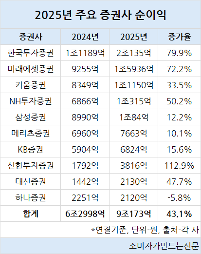 지난해 자기자본 기준 10대 증권사의 연결기준 당기순이익은 총 9조173억 원으로 전년 동기 대비 43.1% 증가했다.