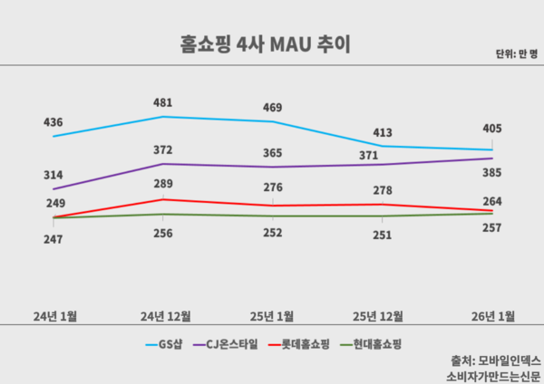 반면 MAU가 떨어진 GS샵은 2023년 1조1313억 원에서 2024년 1조521억 원, 지난해 1조491억 원으로 하락세다.