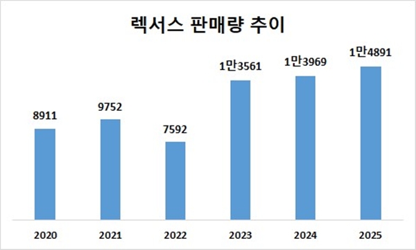 실제 렉서스는 ES 판매 호조에 힘입어 2023년부터 국내 판매 신기록을 연이어 경신했다. 렉서스의 국내 판매량은 2023년 1만3561대, 2024년 1만3969대, 2025년 1만4891대다.