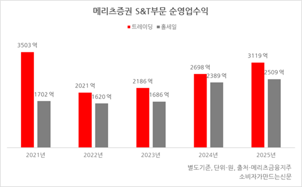 지난해 메리츠증권의 리테일부문 순영업수익은 전년보다 47.9% 증가한 2128억 원을 기록해 2021년 이후 4년 만에 리테일 순영업수익 2000억 원 돌파에 성공했다.