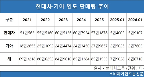 현대차그룹의 지난해 글로벌 판매량 중 11.8%를 인도 시장이 차지했다. 미국, 한국, 유럽에 이어 4번째 규모다. 올해도 판매 분위기는 좋다. 지난 1월 현대차의 판매량은 5만9107대로 전년 동기 대비 9.5%, 기아는 2만7603대로 10.3% 늘었다.