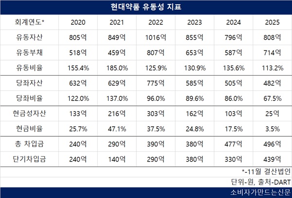 현대약품의 유동성지표는 오너 3세 이상준 대표가 단독대표로 경영에 나선 2021년 이후 지속해서 하락하고 있다.