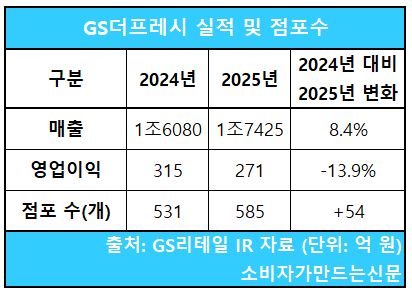 지난해 GS더프레시의 매출은 1조7425억 원으로 전년 1조6080억 원 대비 8.4% 증가했다. 다만 신규 출점에 따른 투자 및 고정비 부담으로 영업이익은 315억 원에서 271억 원으로 13.9% 감소했다.