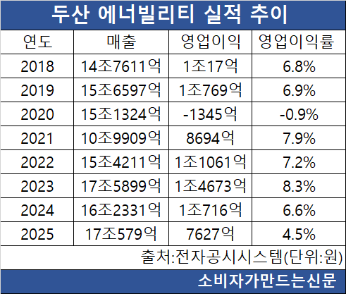 이는 연결 기준 실적에 반영되는 자회사 두산밥캣의 실적 둔화와 과거 저수익 플랜트 프로젝트 비용 반영 등이 영향을 미친 것으로 분석된다. 여기에 원전과 가스터빈 등 성장 사업의 매출 인식이  본격화되지 않은 점도 단기 수익성에 부담으로 작용한 것으로 보인다.