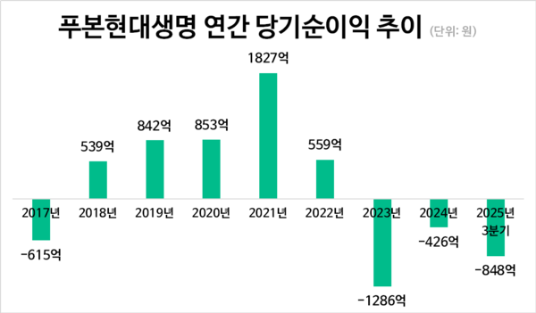 다만 IFRS17 도입 후 푸본현대생명의 실적은 본격적으로 뒷걸음질하게 됐다. 2023년 IFRS17 도입이 시작된 첫 해 푸본현대생명의 당기순손실은 1286억 원으로 적자전환했다. 이후에도 ▲2024년(-426억 원) ▲2025년 3분기(-848억 원)을 기록했다.