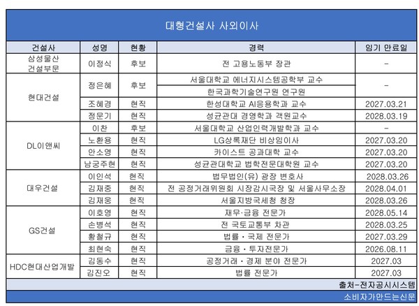 GS건설(대표 허윤홍)과 대우건설(대표 김보현), HDC현대산업개발(대표 정경구·조태제)은 기존 사외이사들 임기가 만료되지 않았다.