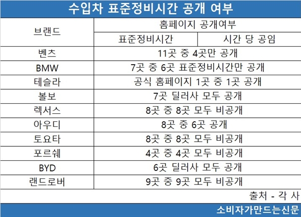 10일 소비자가만드는신문이 지난해 수입차 판매 상위 10개 브랜드를 대상으로 홈페이지에 표준정비시간 고지 여부를 조사한 결과, 렉서스·토요타·포르쉐·랜드로버 등 4개사는 브랜드 홈페이지와 딜러사 홈페이지 어디에서도 공개하지 않고 있다.
