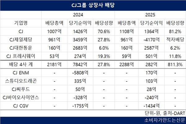 실제 CJ의 지난해 별도 기준 당기순이익은 1355억 원이며 배당총액은 순이익 대비 81.8% 수준이다.