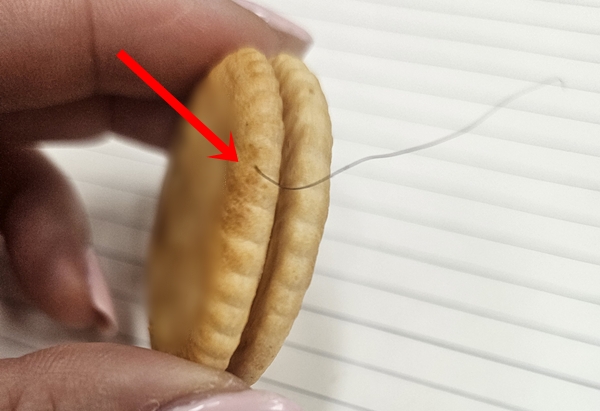 크래커 옆면에 콕 박힌 이물질은 머리카락 같기도 했으나 꼬불꼬불하고 끝으로 갈수록 가늘어져 다른 체모 같다는 게 강 씨 주장이다.