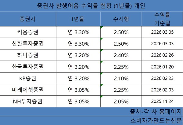 국내 증권사 중 발행어음 잔액이 가장 많은 한국투자증권(대표 김성환)과 KB증권(대표 강진두·이홍구)은 연 3.2% 금리를 제공했다. 반면 미래에셋증권(대표 김미섭·허선호)과 NH투자증권(대표 윤병운)은 연 3.05%를 기록하며 상대적으로 낮은 편이었다.