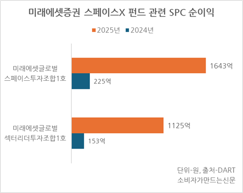 미래에셋증권이 스페이스X 투자 펀드 조성을 위해 만든 특수목적법인(SPC) 2곳의 지난해 당기순이익은 총 2768억 원으로 전년보다 약 7.3배 증가했다.