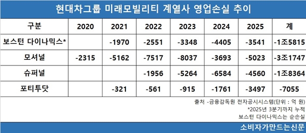 19일 금융감독원 전자공시시스템에 따르면 보스턴다이나믹스, 모셔널, 포티투닷, 슈퍼널 등 현대차그룹의 미래모빌리티 핵심 계열사 4곳은 설립 이후 매년 적자를 기록하고 있는 것으로 나타났다.  법인 설립 이후 이들 4사의 총 누적 손실은 무려 7조2981억원에 달한다.