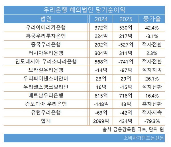 우리은행 역시 지난해 해외법인 당기순이익이 434억 원으로 직전년도 2099억 원 대비 79.3% 감소했다. 베트남우리은행과 우리아메리카은행의 지난해 당기순이익이 각각 716억 원과 539억 원으로 사상 최대 실적을 달성했지만 중국우리은행(-527억 원), 인도네시아 우리소다라은행(-741억 원)에서 대규모 적자가 발생했다.