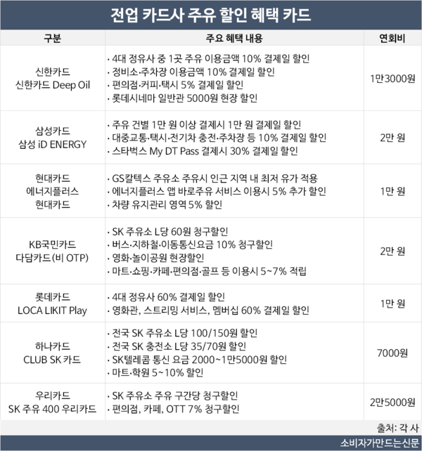 주유 할인 카드는 기본적으로 4대 정유사(GS칼텍스·SK에너지·S-Oil·HD현대오일뱅크) 이용 시 할인 혜택이 주어지는데 카드사들은 이 외 일상생활 할인이나 대중교통 할인 등 부가적인 혜택을 추가했다.
