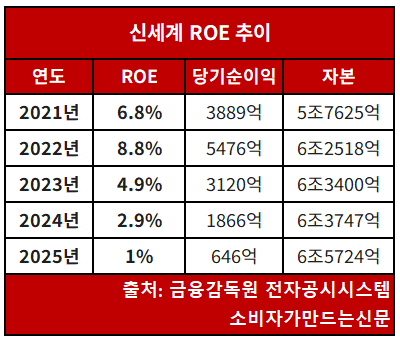 19일 금융감독원 전자공시시스템에 따르면 신세계의 ROE는 최근 5년간 뚜렷한 하락 흐름을 보이고 있다. 2021년 6.8%에서 2022년 8.8%로 상승했지만 이후 ▲2023년 4.9% ▲2024년 2.9%로 떨어진 데 이어 지난해 1% 수준까지 내려앉았다.