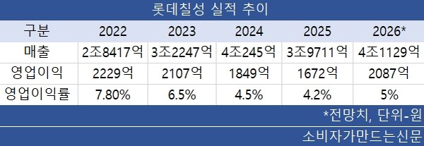 롯데칠성은 지난해 11월에도 2025년 매출 4조300억 원, 영업이익 1850억 원으로 연간 목표를 하향 조정했지만 이마저 달성하지 못했다. 지난해 매출은 3조9711억 원, 영업이익 1672억 원을 기록하는데 그쳤다.