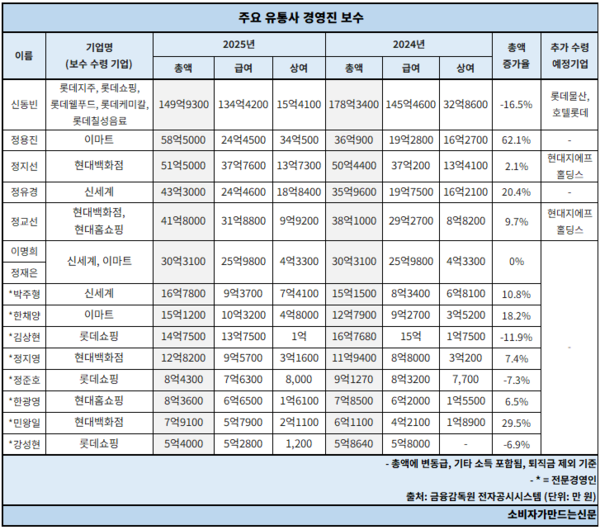 롯데쇼핑의 경우 지난해 11월 임원인사에서 단행된 고강도 인적 쇄신의 여파가 보수 총액에 고스란히 반영됐다. 용퇴한 전문경영인들의 경우 퇴직 소득이 일시에 합산되며 겉으로 드러난 총액은 크게 불어났으나 이를 제외한 실질 보수는 오히려 뒷걸음질 쳤다.