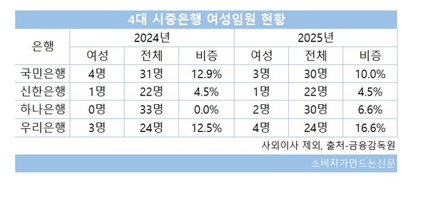 KB국민은행(행장 이환주)는 4명에서 3명으로 줄었지만 시중은행 중에서는 많은 편이다. 신한은행(행장 정상혁)은 수 년째 여성 임원 1명만 유지되고 있다.
