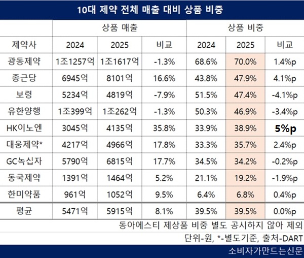 10대 제약사 중 5곳 상품 매출 비중 상승...광동제약 70% 가장 높고 한미약품 6.8% 최저