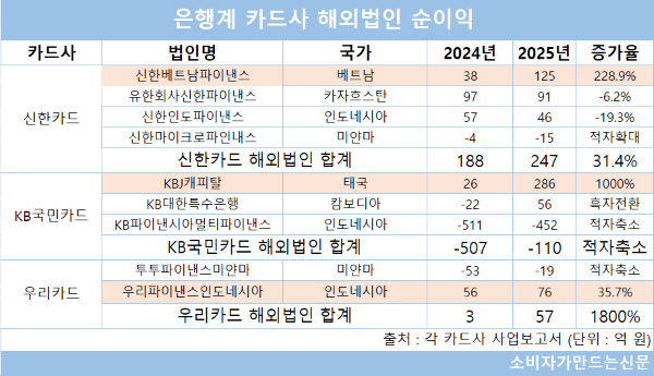 순이익 규모가 가장 큰 곳은 신한카드로 해외법인 4곳에서 지난해 247억 원의 순이익을 기록해 전년 대비 31.4% 증가했다.