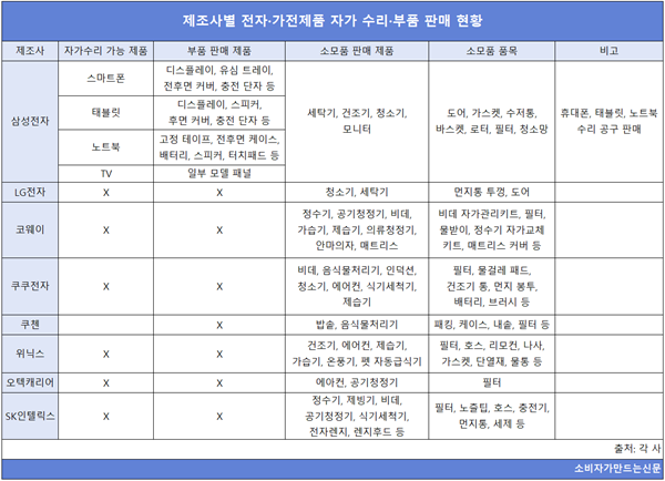 생활가전 전문 제조사로 범위를 넓히면 자가 수리 영역은 더욱 좁아진다. 코웨이, 쿠첸, 쿠쿠전자, 위닉스, 오텍캐리어 등 주방·생활 가전 업체들은 자가 수리를 허용하지 않고 있다.