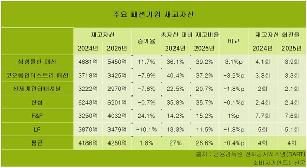 재고자산 회전율은 F&F가 7.6회로 가장 높고 LF 5.1회, 삼성물산 패션부문 3.9회, 코오롱FnC 3.3회 순이다.