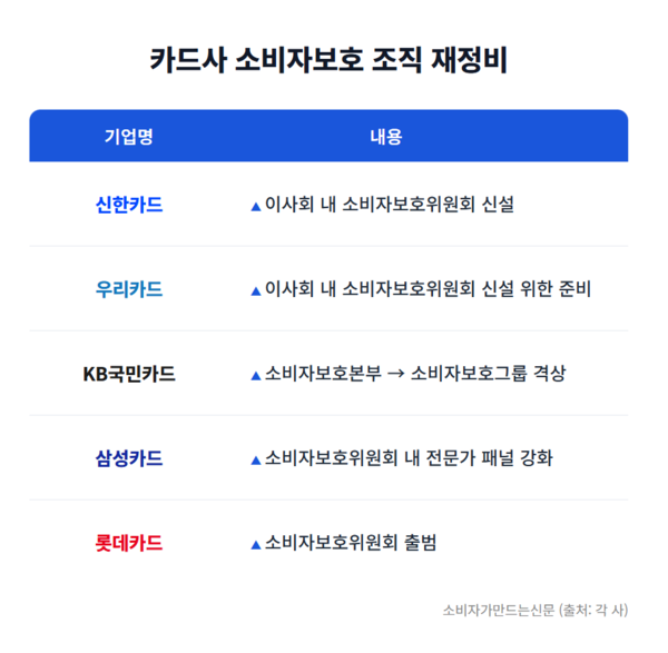 신한카드와 우리카드는 업계 최초로 이사회 내 소비자보호위원회를 신설했으며 KB국민카드는 소비자 부서를 격상했다. 롯데카드는 소비자보호위원회를 공식 출범시켰으며 삼성카드는 소비자보호위원회 전문가 패널을 강화했다.