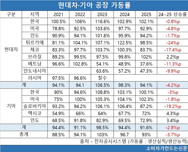 현대차와 기아가 지난해 한국과 미국, 인도의 생산능력을 확대했지만 유럽시장 판매부진으로 튀르키예와 체코, 슬로바키아 공장 생산실적이 감소하면서 전체 공장 가동률이 하락한 것으로 분석된다.