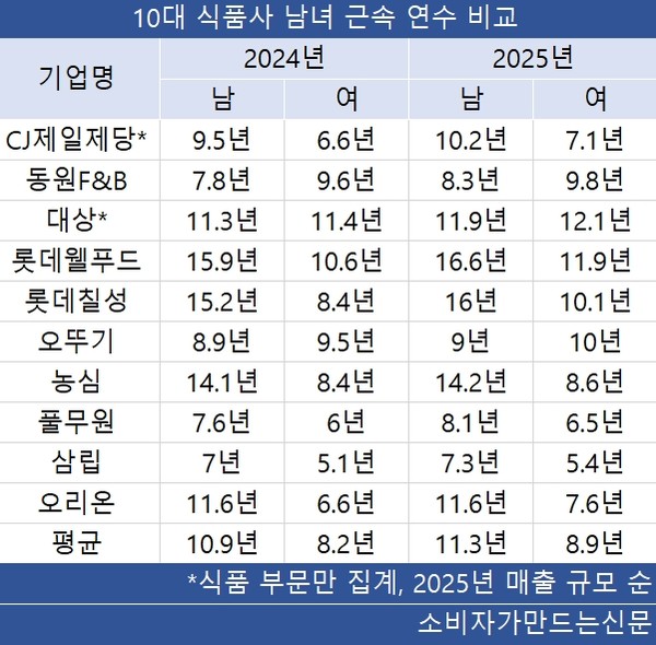 대상, 동원F&B(대표 김성용), 오뚜기는 여성이 남성보다 평균 근속 연수가 더 높지만 임금은 남성이 더 많은 것으로 나타났다.