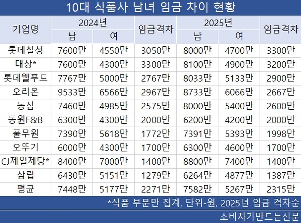 ▲롯데웰푸드(대표 서정호) ▲오리온(대표 이승준) ▲농심(대표 조용철) 등 업체들도 남녀 급여 격차가 평균인 2315만 원을 웃돌았다.