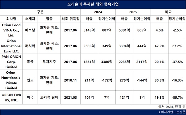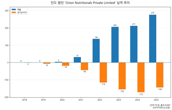 27일 오리온이 투자한 해외 종속기업 5곳 중 인도 소재 ‘Orion Nutritionals Private Limited(이하 인도 법인)’는 지난해 144억 원의 순손실을 냈다. 전년 172억 원 대비 규모는 축소됐다. 법인이 설립된 2018년 이후 8년 연속 적자로 그 규모는 총 660억 원에 달한다. 매출은 275억 원으로 전년 대비 30.3% 증가했다.