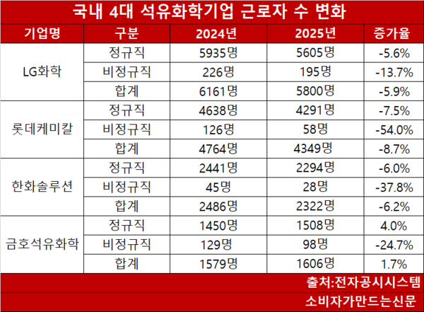 금호석유화학 홀로 직원 수 증가...불황 시달리는 LG화학·롯데케미칼·한화솔루션은 6~8% 감축