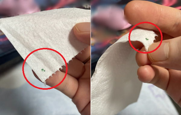 두루마리 휴지 한 롤에서 칸칸이 점 같은 물질이 박혀 있었다. 햇빛에 비춰보자 반짝거려 비닐 소재 이물로 보인다는 임 씨.