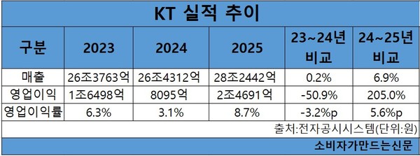 실제 KT의 매출과 영업이익은 지난해 눈에 띄게 증가했지만, 강북본부 부지 개발 등 부동산 일회성 요인이 크기 때문에 통신과 AI 본업의 지속 성장성을 입증하는 것이 박 대표의 핵심 과제로 꼽힌다.