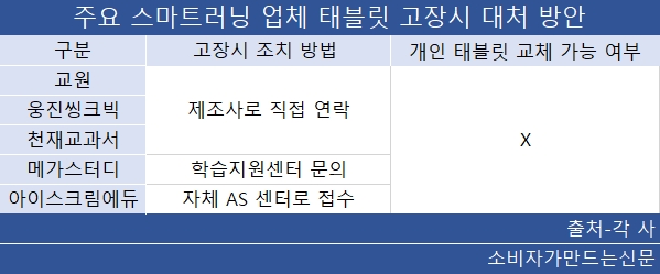 전용 학습 기기 고장 시 '메가스터디'와 '아이스크림에듀'를 제외하면 4개사 모두 이용자가 직접 단말기 제조사의 서비스센터에 AS를 신청해야 한다.