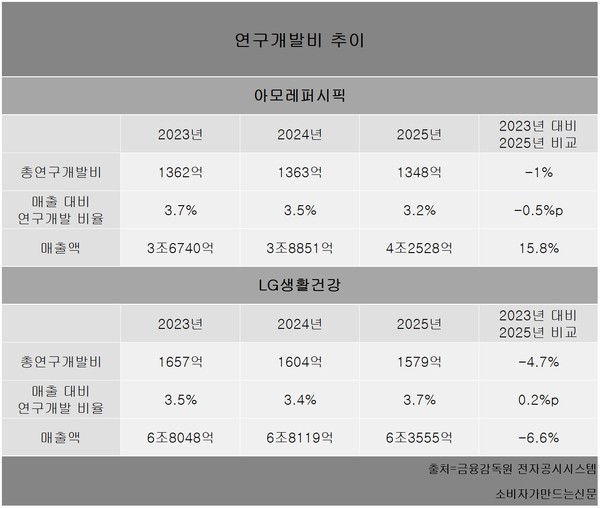 매출 대비 R&D 투자 비중은 LG생활건강이 3.7%, 아모레퍼시픽은 3.2%다. 2023년과 비교하면 LG생활건강은 0.2%포인트 높아졌고 아모레퍼시픽은 0.5%포인트 낮아졌다. 다만 LG생활건강의 연구개발 투자 비중이 높아진 것은 연구개발 투자 규모를 크게 줄이지 않은 상황에서 매출이 감소세에 있기 때문이다.